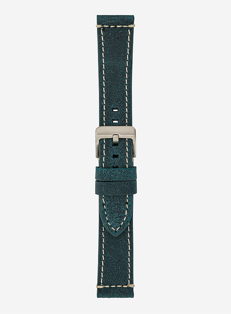 Vintage leather watchstrap, italian leather. Stainless steel buckle, genuine leather lining, cut edge finish and flat structure with beige stitchings.