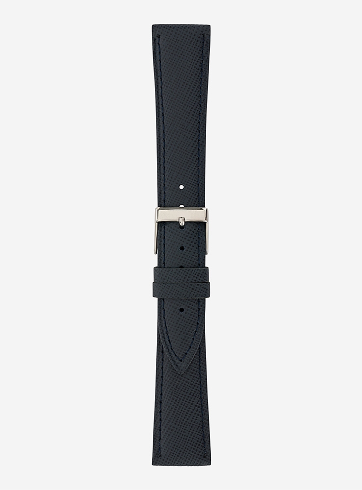 Cinturino per orologio in vitello stampa saffiano, pelle italiana. Fibbia in acciaio, fodera in vera pelle, finitura semi-ribordata e struttura semi-imbottita con cuciture.